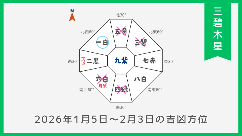 - 2026年1月度の月干支は『丑』になるので、反対側の『南西』が月破になります。