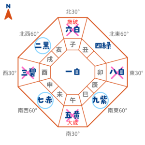 - 年盤で北西は吉方位だが、月盤では凶方位になる。