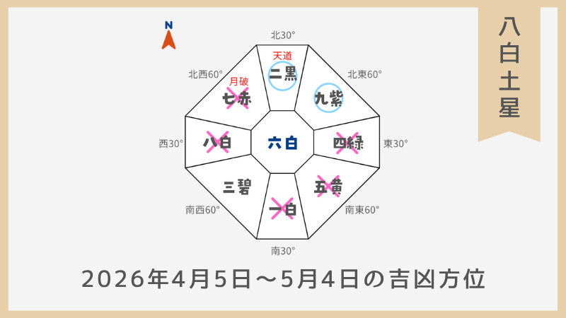 - 2026年4月度の月干支は『辰』になるので、反対側の『北西』が月破になります。