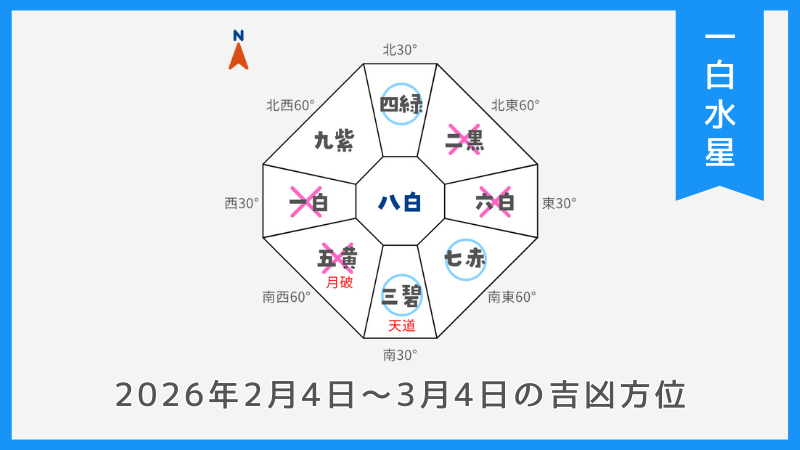 - 2026年2月度の月干支は『寅』になるので、反対側の『南西』が月破になります。
