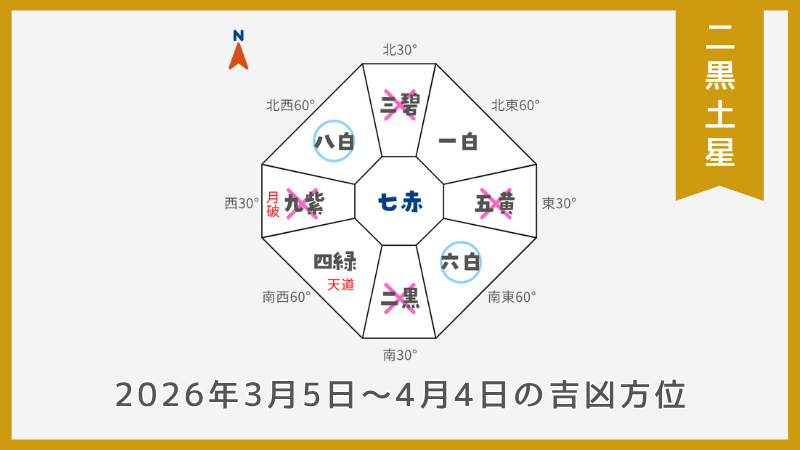 - 2026年3月度の月干支は『寅』になるので、反対側の『南西』が月破になります。