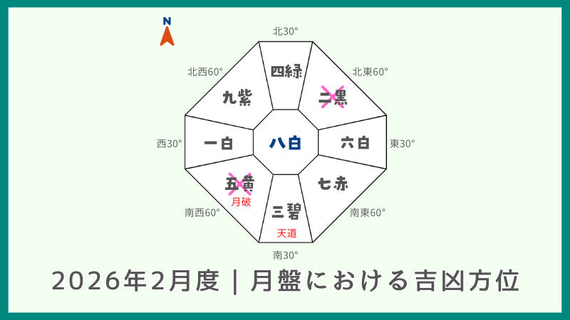 2月度(2026/2/4~3/4)の月盤による各本命星ごとの吉方位・凶方位です。