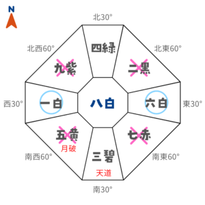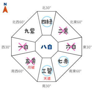 - 年盤で北西は吉方位だが、月盤では凶方位になる。