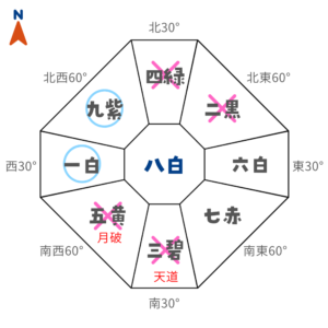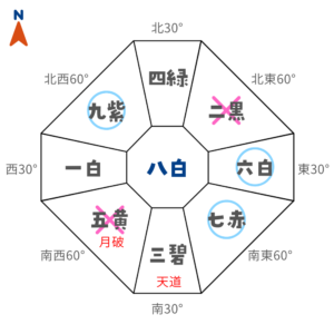 - 年盤で北西は吉方位、月盤でも吉方位なので、年盤+月盤ともに吉方位になる。
