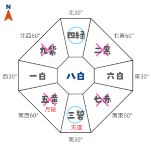- 年盤で南東は吉方位、月盤でも吉方位なので、年盤+月盤ともに吉方位になる。