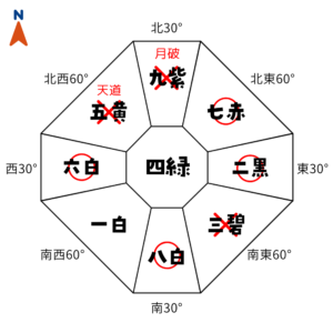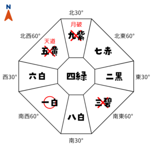 - 年盤で北西は吉方位だが、月盤では凶方位になる。