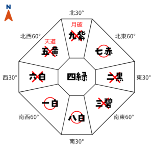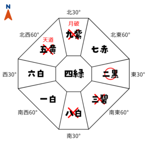- 年盤で北東は吉方位だが、月盤では凶方位になる。
