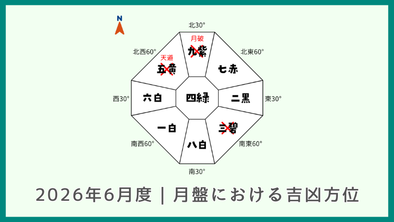 2026年6月度(2026/6/6~7/6)の月盤による各本命星ごとの吉方位・凶方位です。