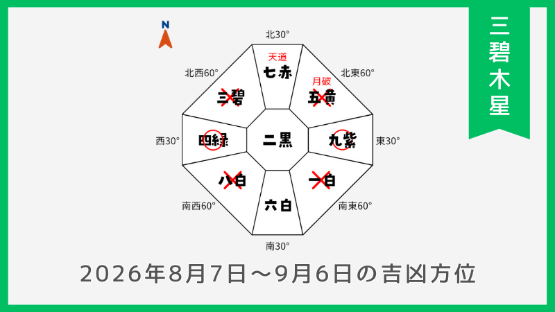 - 2026年8月度の月干支は『申』になるので、反対側の『北東』が月破になります。
