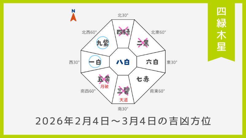 - 2026年2月度の月干支は『寅』になるので、反対側の『南西』が月破になります。