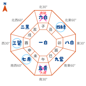 午年なので、南に大歳、反対側の北が歳破になります。